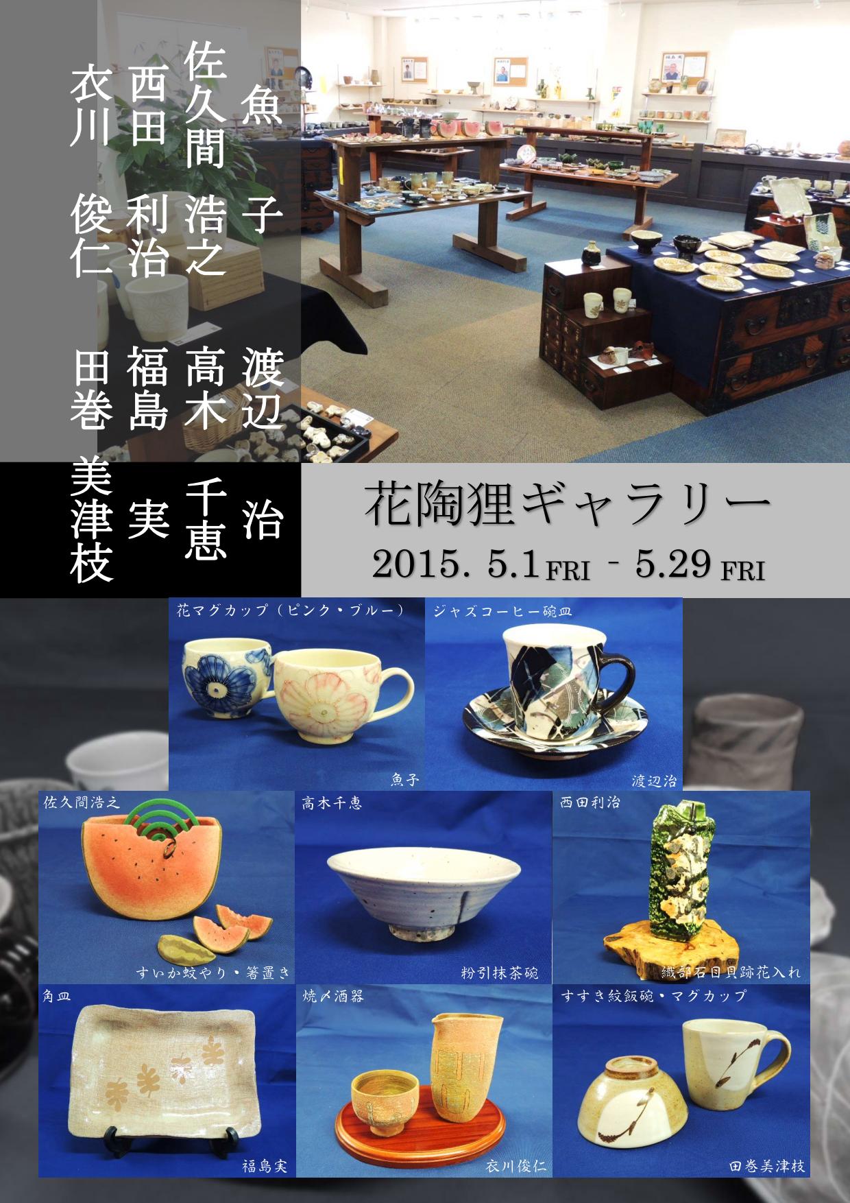 5月花陶狸ギャラリーのお知らせ 作家名 魚子・渡辺 治・佐久間 浩之・高木 千恵・ 西田 利治・福島 実・衣川 俊仁・田巻 美津枝 8人の作家の個性豊かな作品が並びます。 花陶狸ギャラリーまで、どうぞお越し下さいませ。
